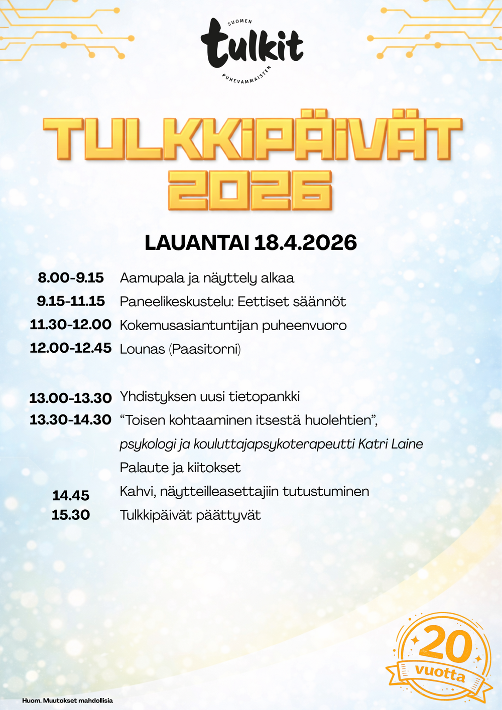 Tulkkipäivät järjestetään pe-la 17.-18.4.2026 Paasitornissa (Paasivuorenkatu 5 A, Helsinki). Tapahtumaan kokoontuu puhevammaisten tulkkeja ja kommunikaatio-ohjaajia ympäri Suomea kouluttautumaan, kohtaamaan kollegoja ja juhlimaan SPT ry:n 20-vuotista taivalta. Tulkkipäivät kruunaa perjantain upea iltajuhla!